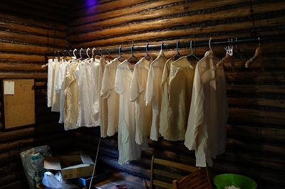 寸胴2つを煮立たせて、その中に縫製済みの服や生地を投入、この工程でムラの元を作ってしまうことも多いかと思いますので、できるだけ布を湯の中で動かします。